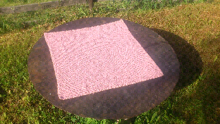 Det vises overhodet ikke på bildet, men teppet er rillestrikket, og jeg begynte i det ene hjørnet og utvidet til ca halvparten av garnet jeg hadde var brukt, før jeg begynte å felle.